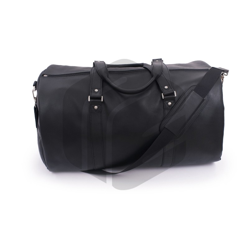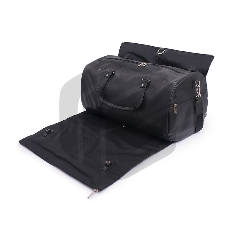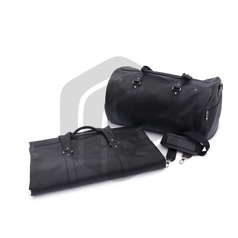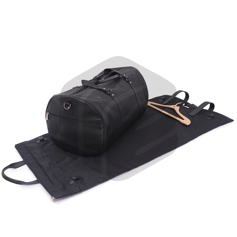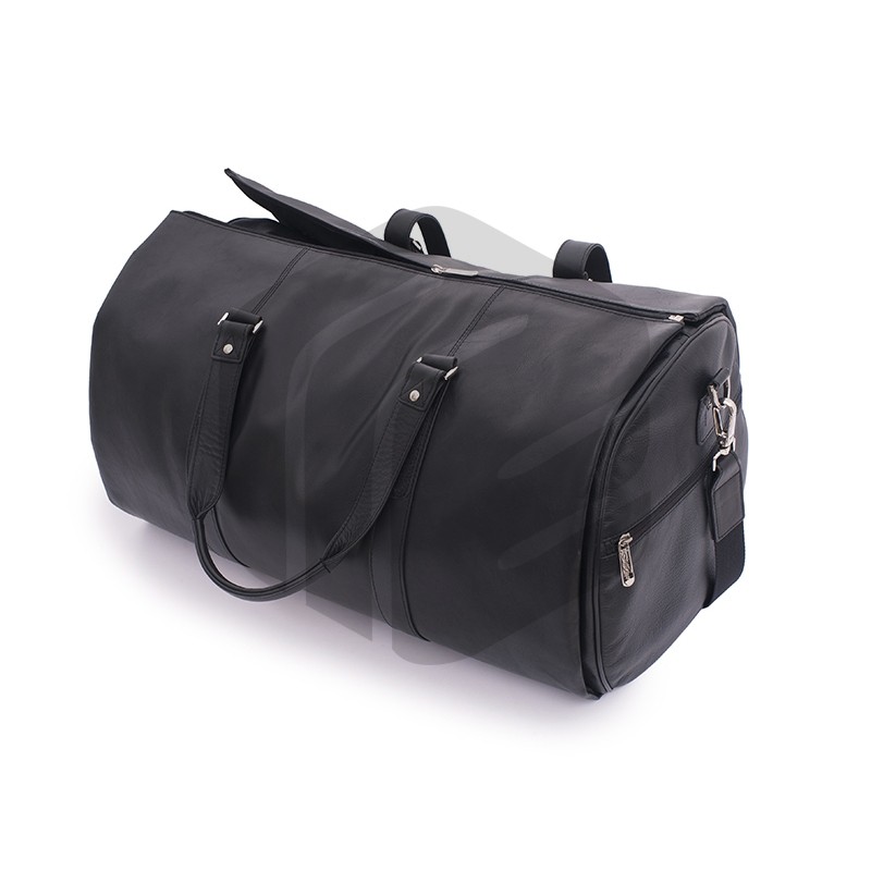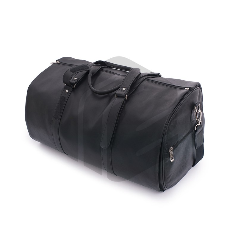 Classic soft leather duffel coat bag featuring top velcro closure, double hand handles, exterior zip pockets, inside zip pocket and a detachable suit carrier with a detachable shoulder strap. A wooden hanger is included with this duffel bag.